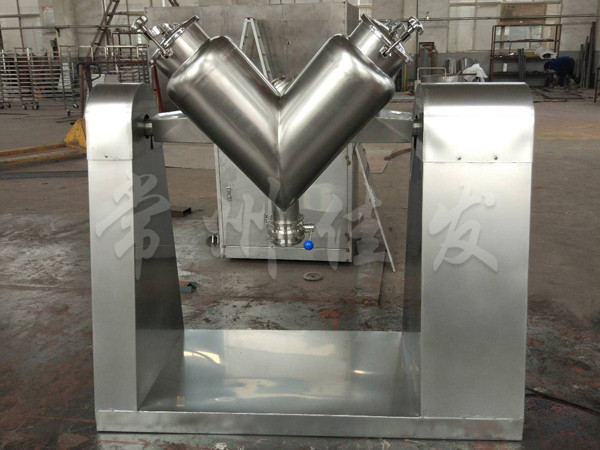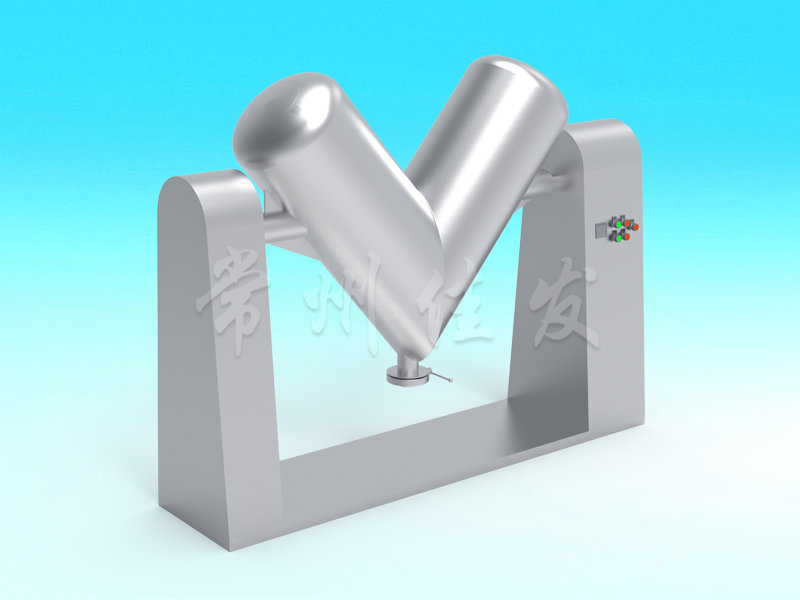 該機(jī)通過機(jī)械傳動(dòng),使不對(duì)稱的V型圓柱體內(nèi)的物料做往復(fù)翻動(dòng),達(dá)到均勻混合之目的。